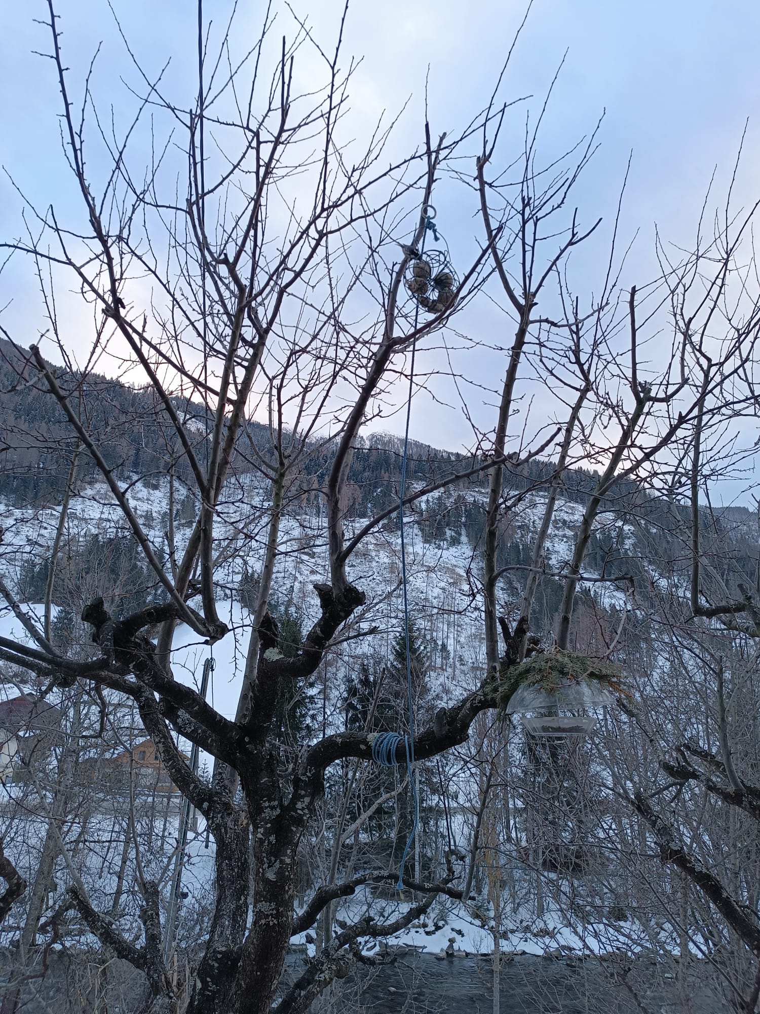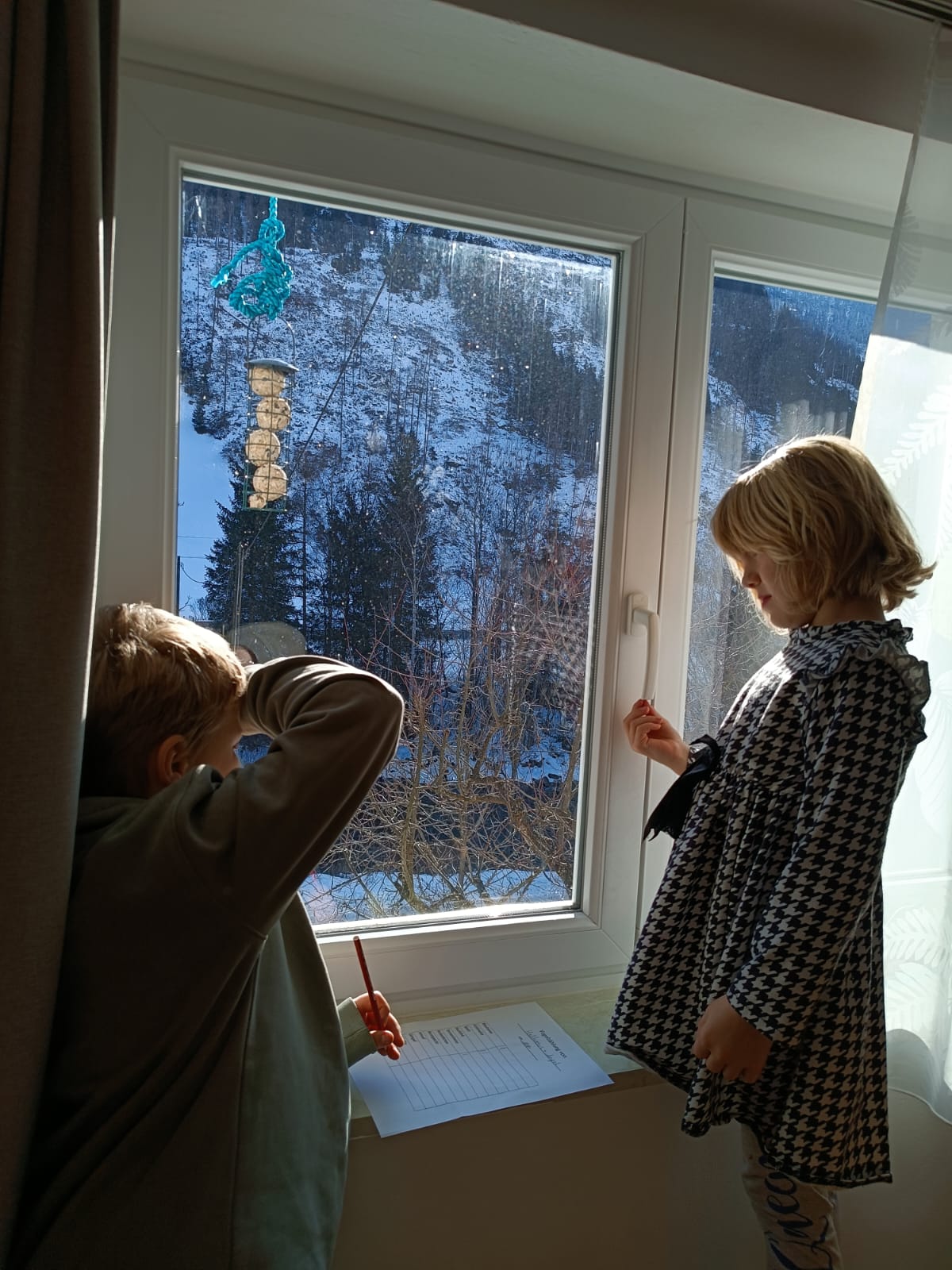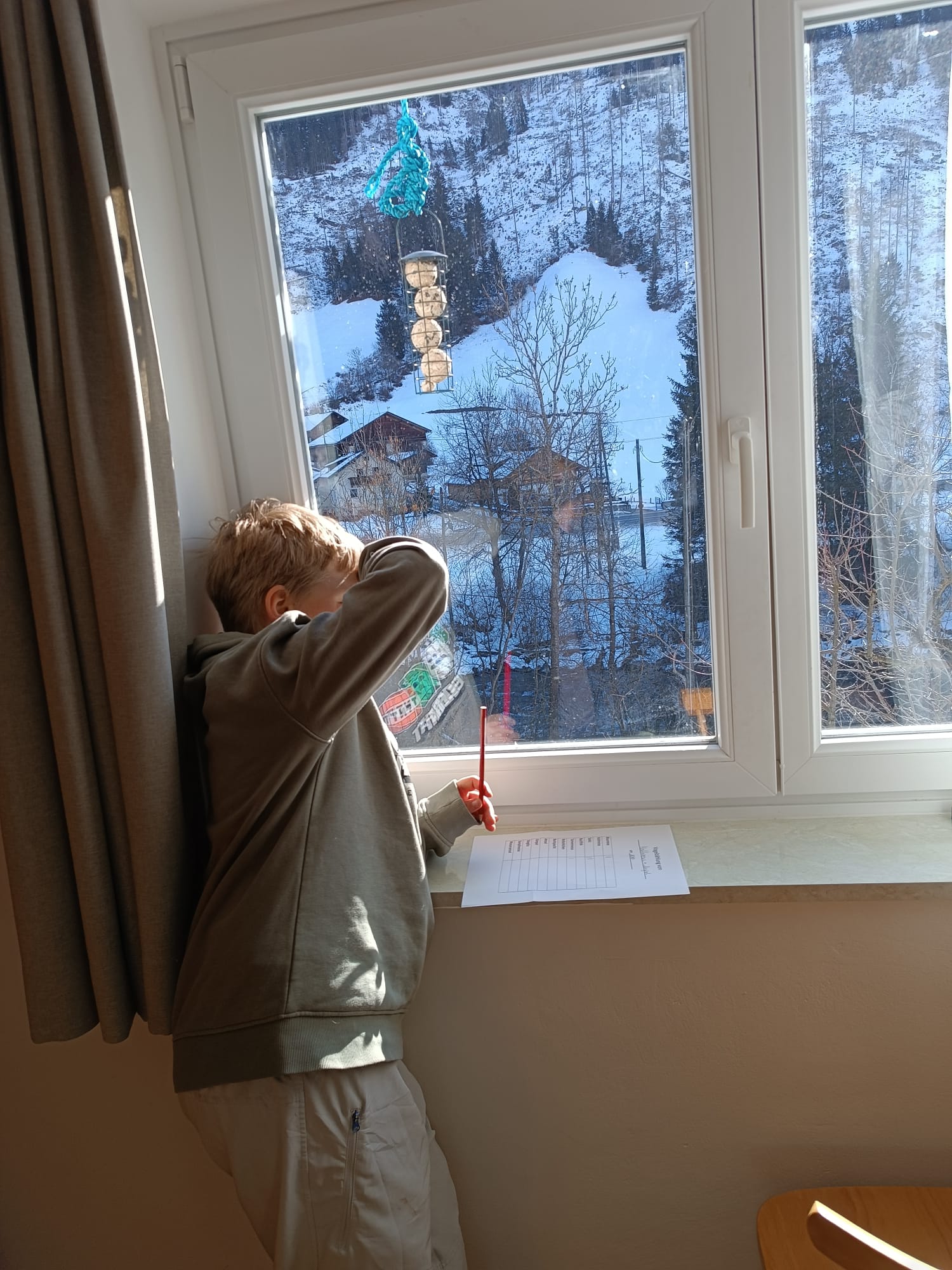 Nach der Theorie folgte die Praxis und wir durften bei unserer Lehrerin Vögel beobachten. Sehen konnten wir sie vorerst nicht, dafür aber hören. Nach einiger Zeit holten sich die kleinen Sänger das Futter von den Häuschen und Futtertürmchen oder sammelten die Kerne von der Straße auf. Leider kamen nicht alle, die unsere Lehrerin sonst zu sehen bekommt, aber vielleicht gibt es ein nächstes Mal oder wir können sie bei uns daheim beobachten.