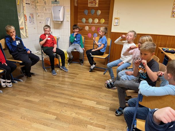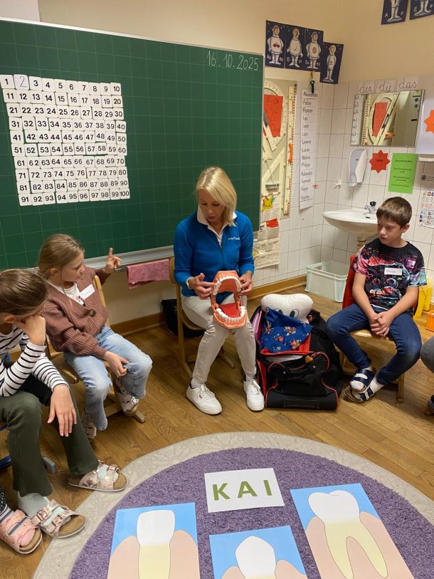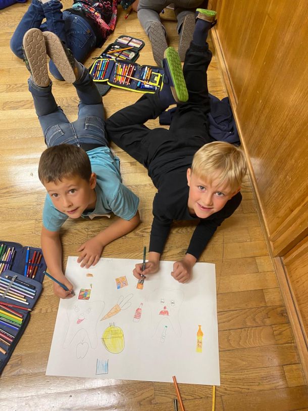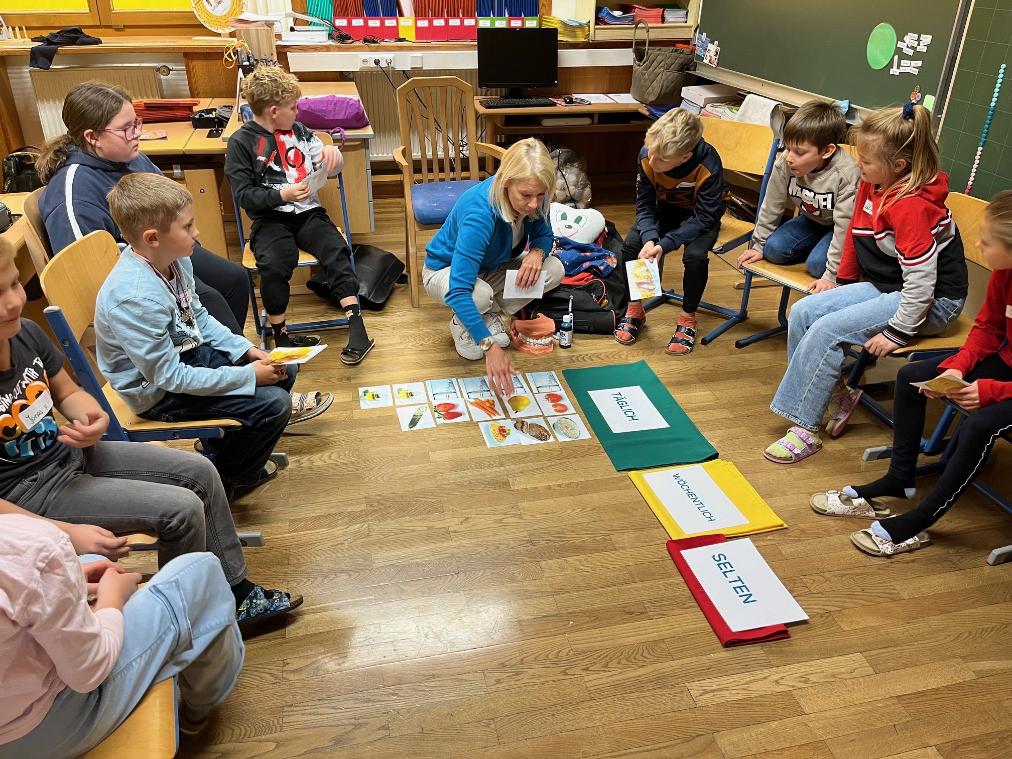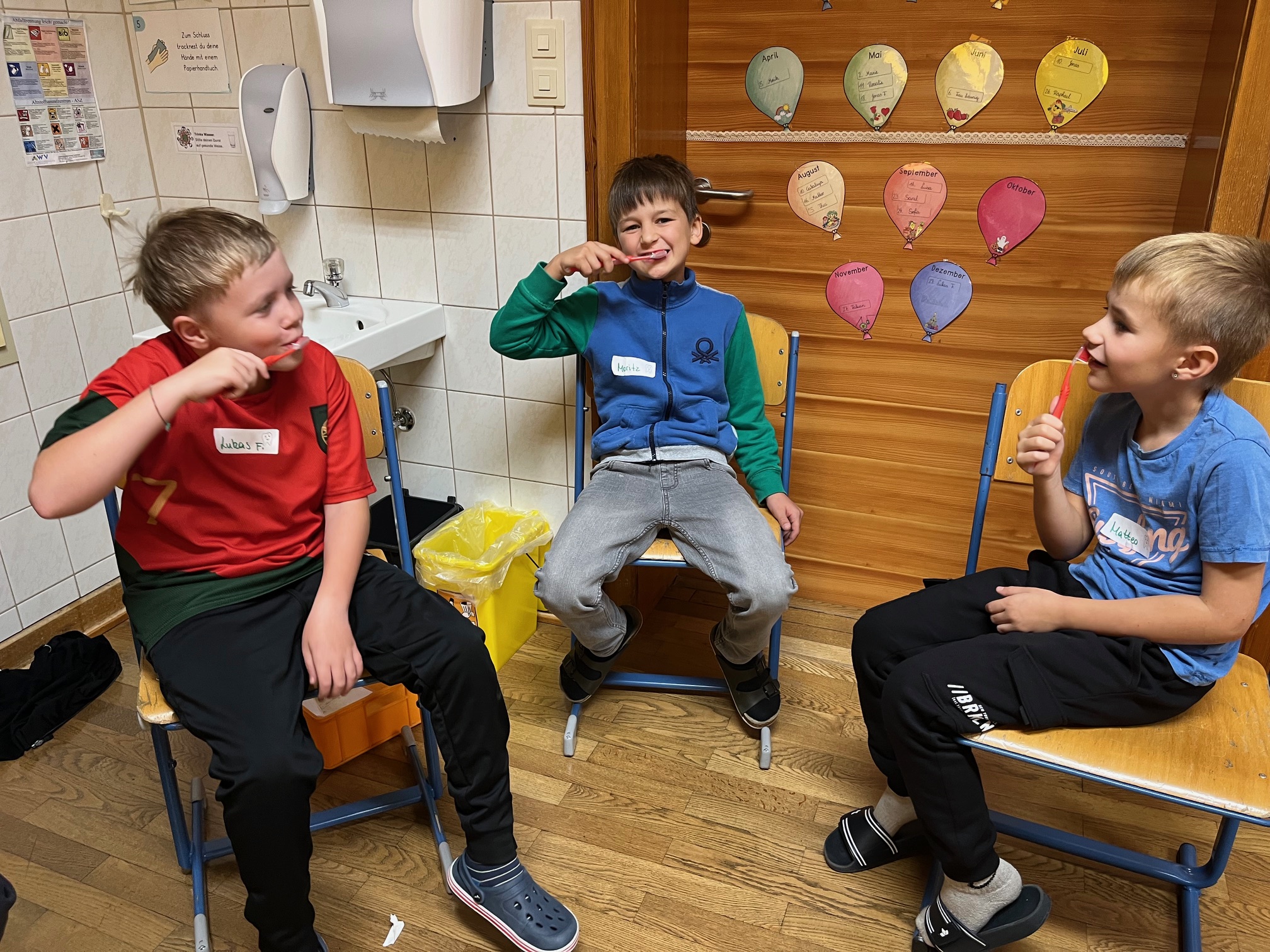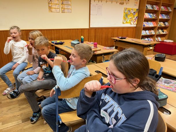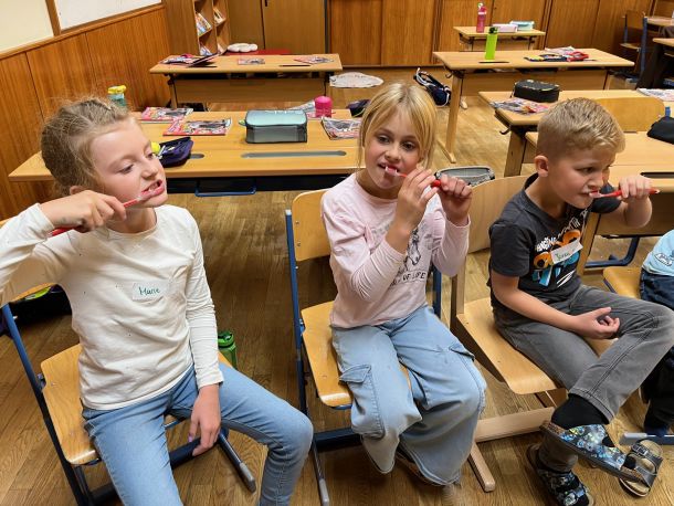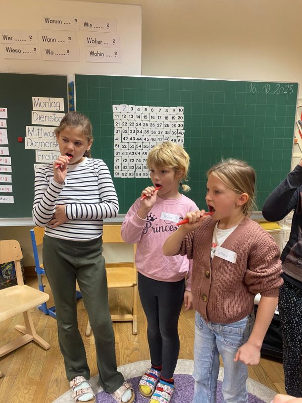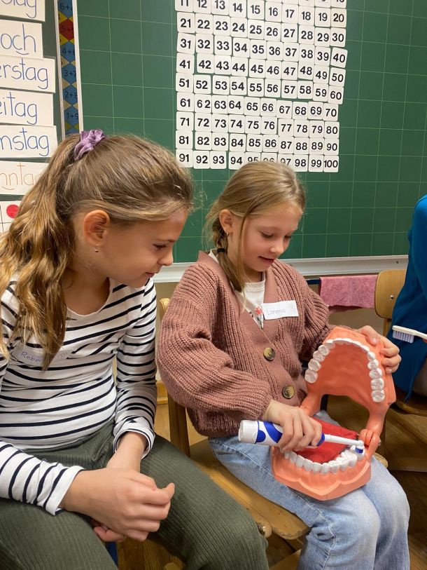 Eine Zahngesundheitsexpertin besuchte die 2. und 3. Klasse Volksschule und zeigte den Kindern, wie man richtig Zähne putzt. Gemeinsam besprachen sie, welche Lebensmittel gut oder schlecht für die Zähne sind, und lernten den Aufbau eines Zahnes kennen.