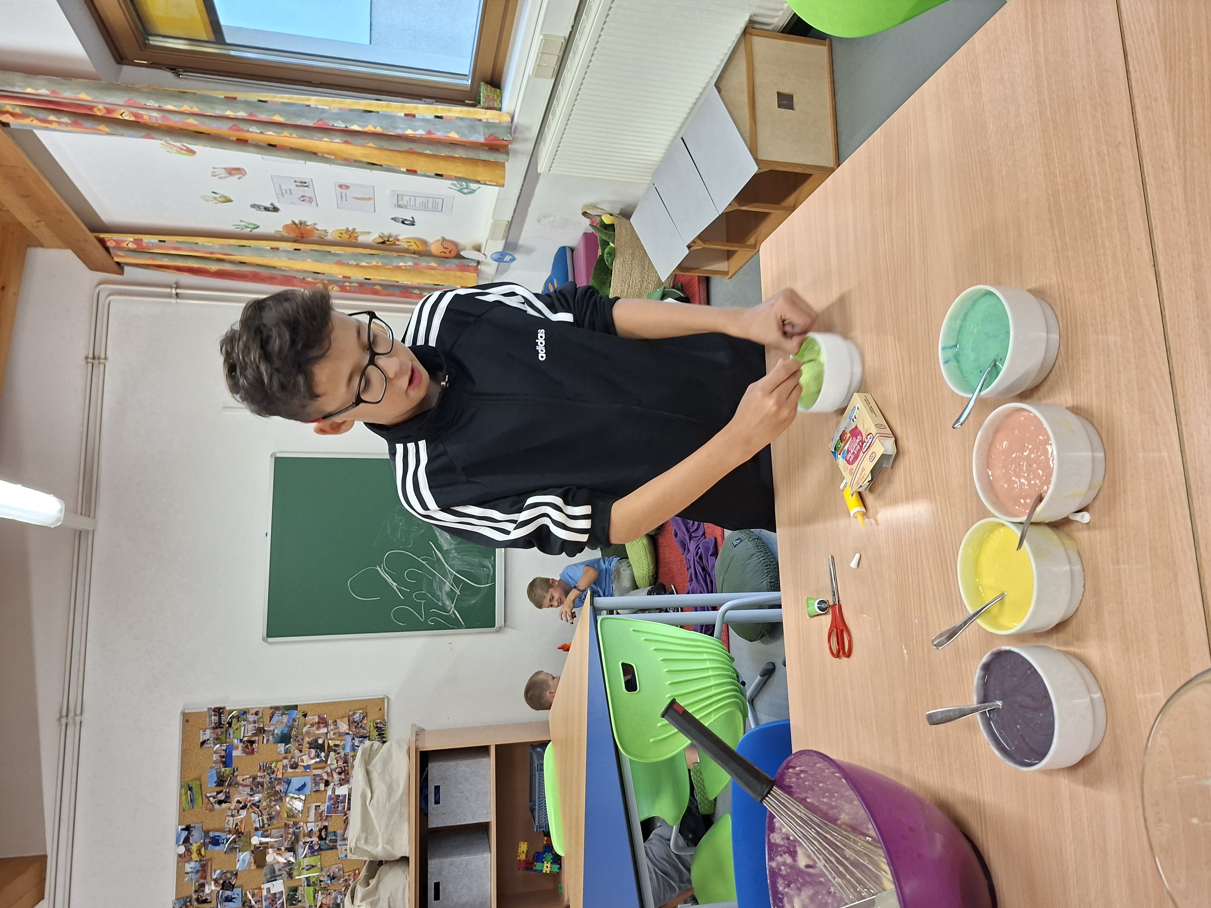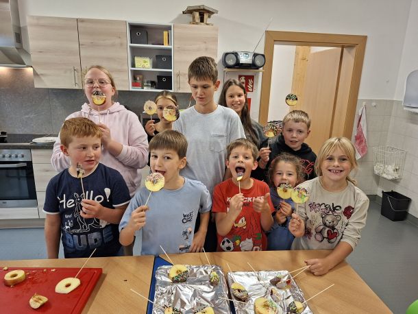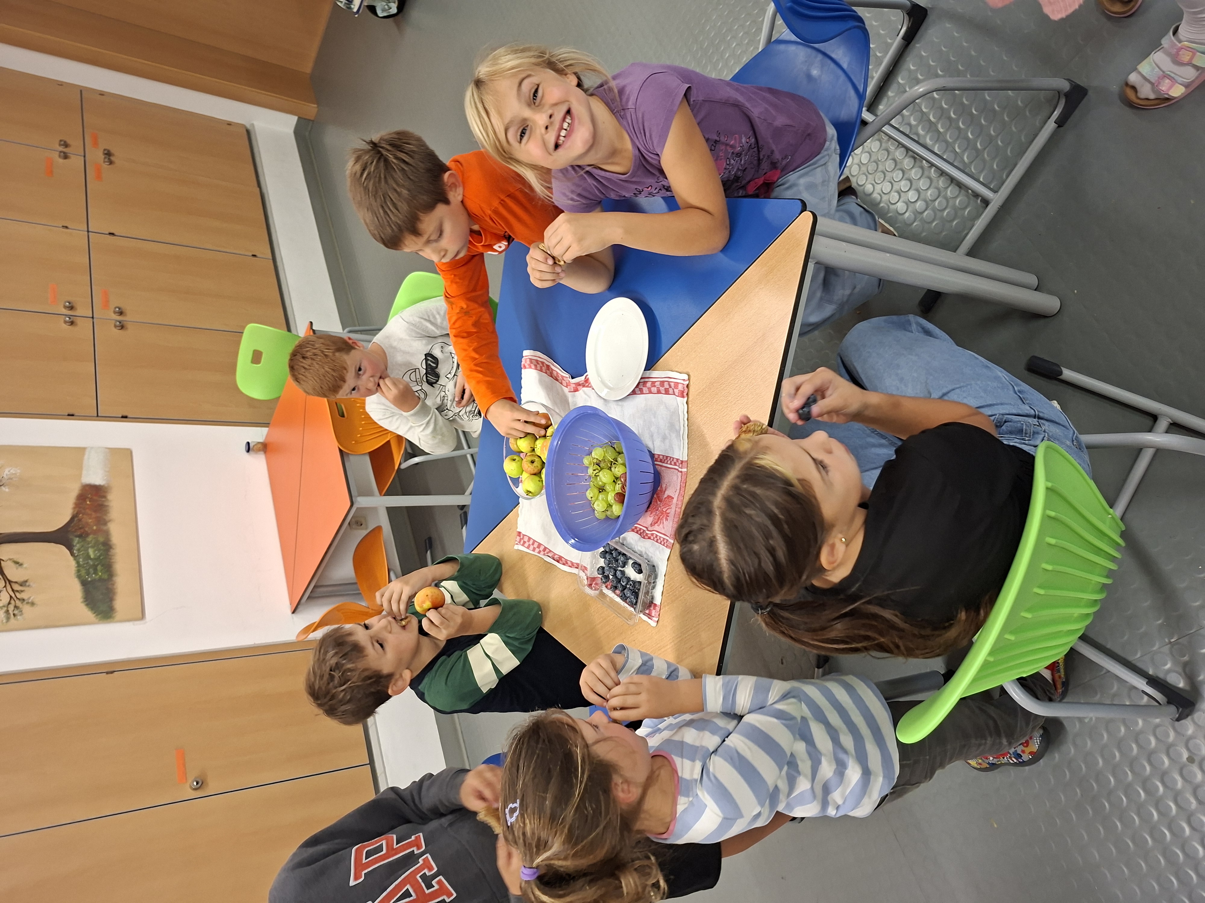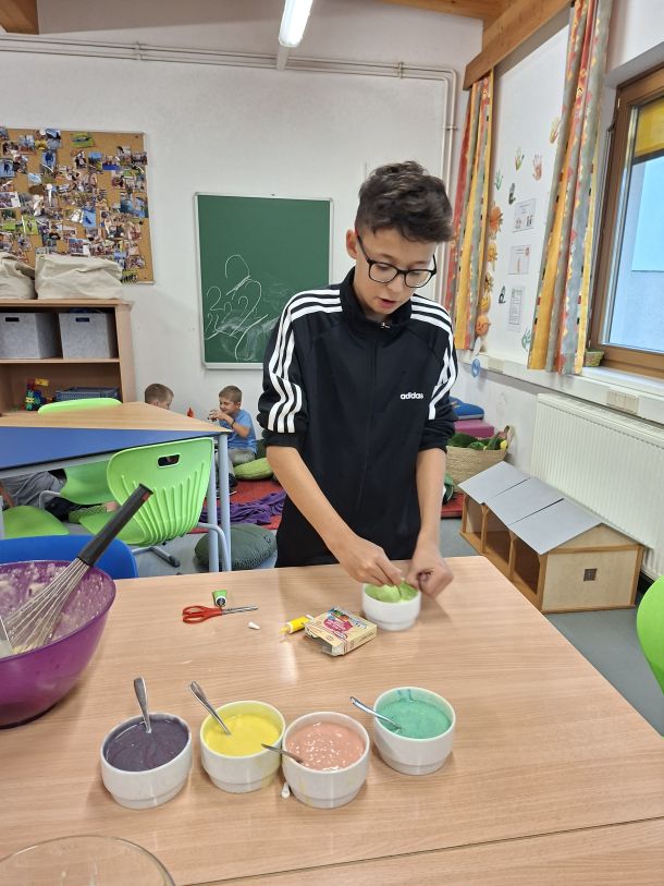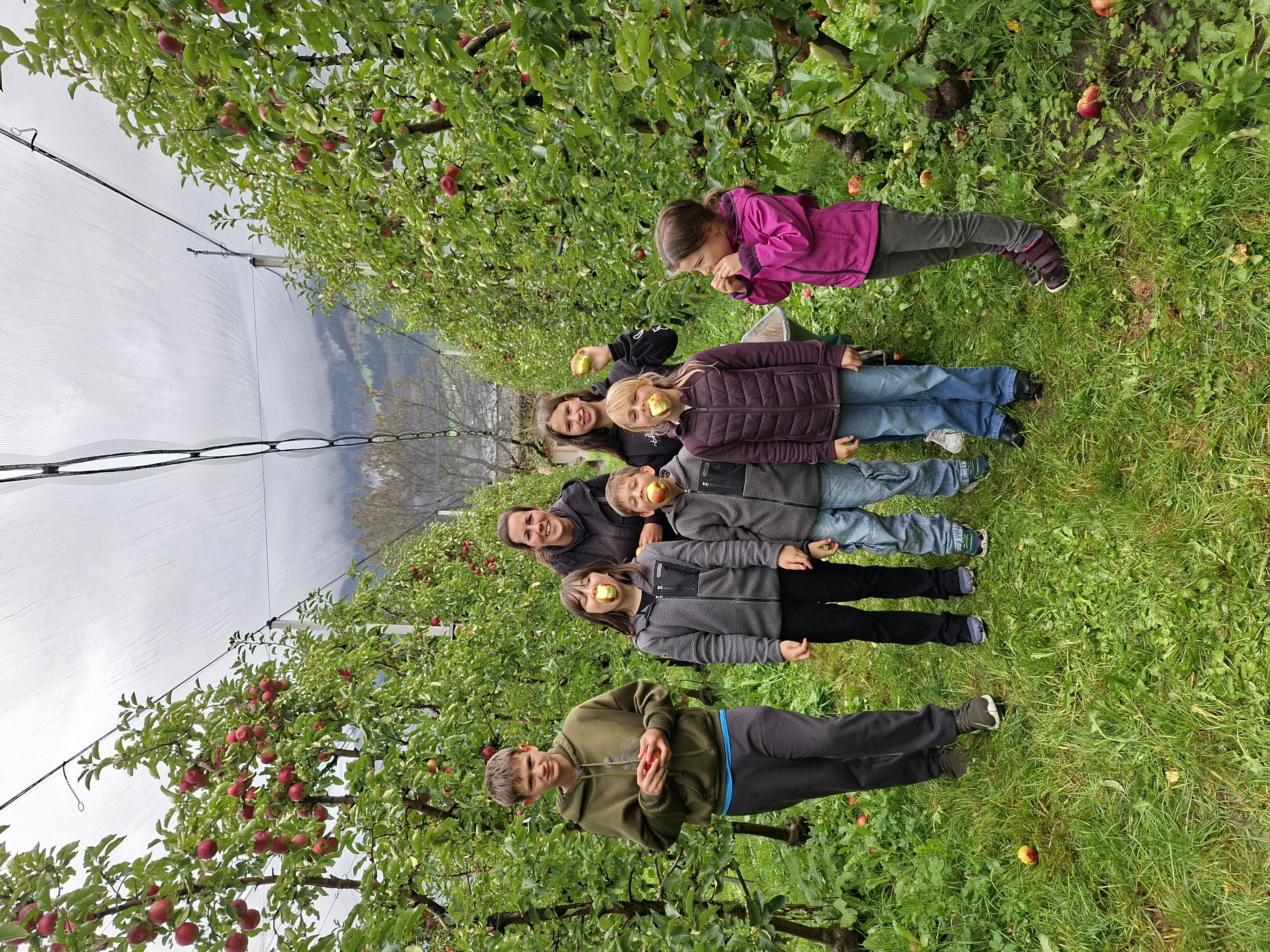 Freddy die Fliege einen Besuch abgestattet. Auch in der Küche haben wir uns ausgetobt und bunte Regenbogenwaffeln sowie leckere und gesunde Apfel-Kekse gebacken. Sogar unsere eigene bunte Knete konnten wir mit wenigen Zutaten selber herstellen und daraus lustige Figuren gestalten. Unser erster Freitags-Ausflug hatte die LLA in Lienz als Ziel, wo wir super saftige und süße Äpfel geerntet haben. Diese haben wir dann zu bunten Apfel-Lollies weiterverarbeitet. Der krönende Abschluss dieses Monats war der Geburtstag von Marcell, den wir mit viel Kuchen gefeiert haben. Wir freuen uns schon jetzt auf
