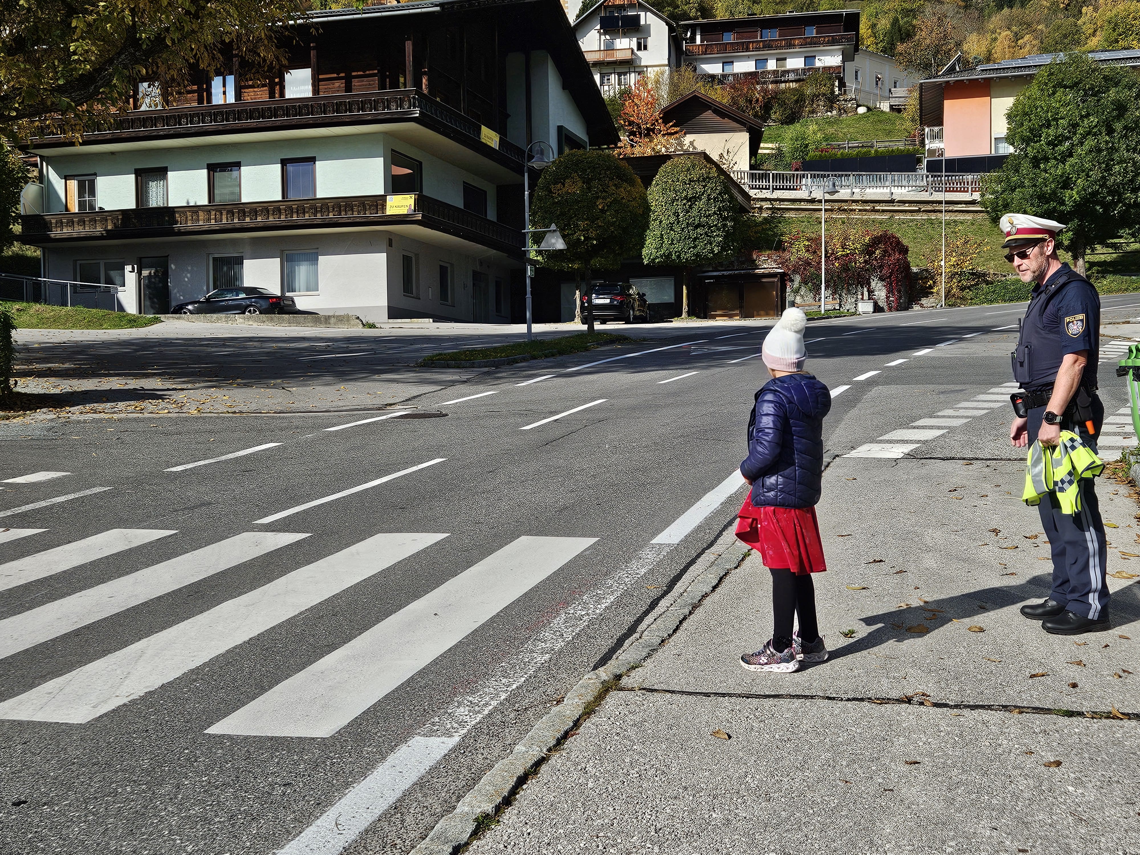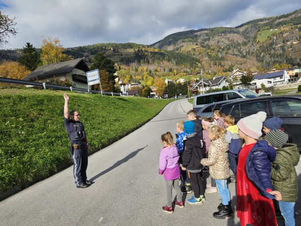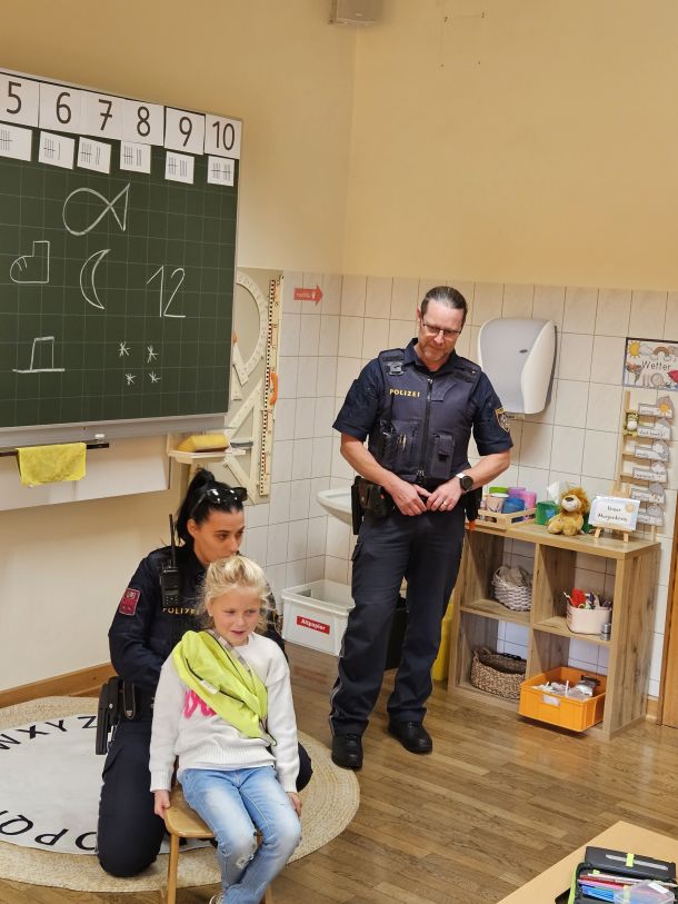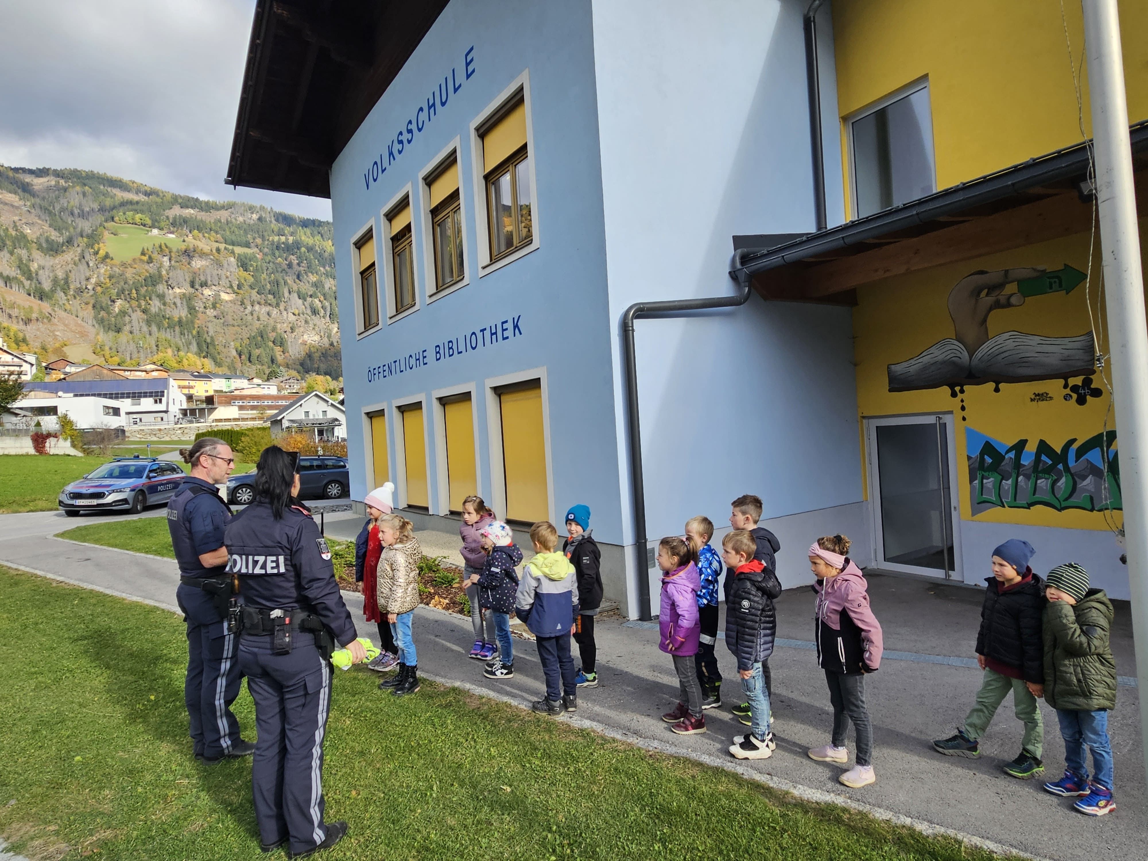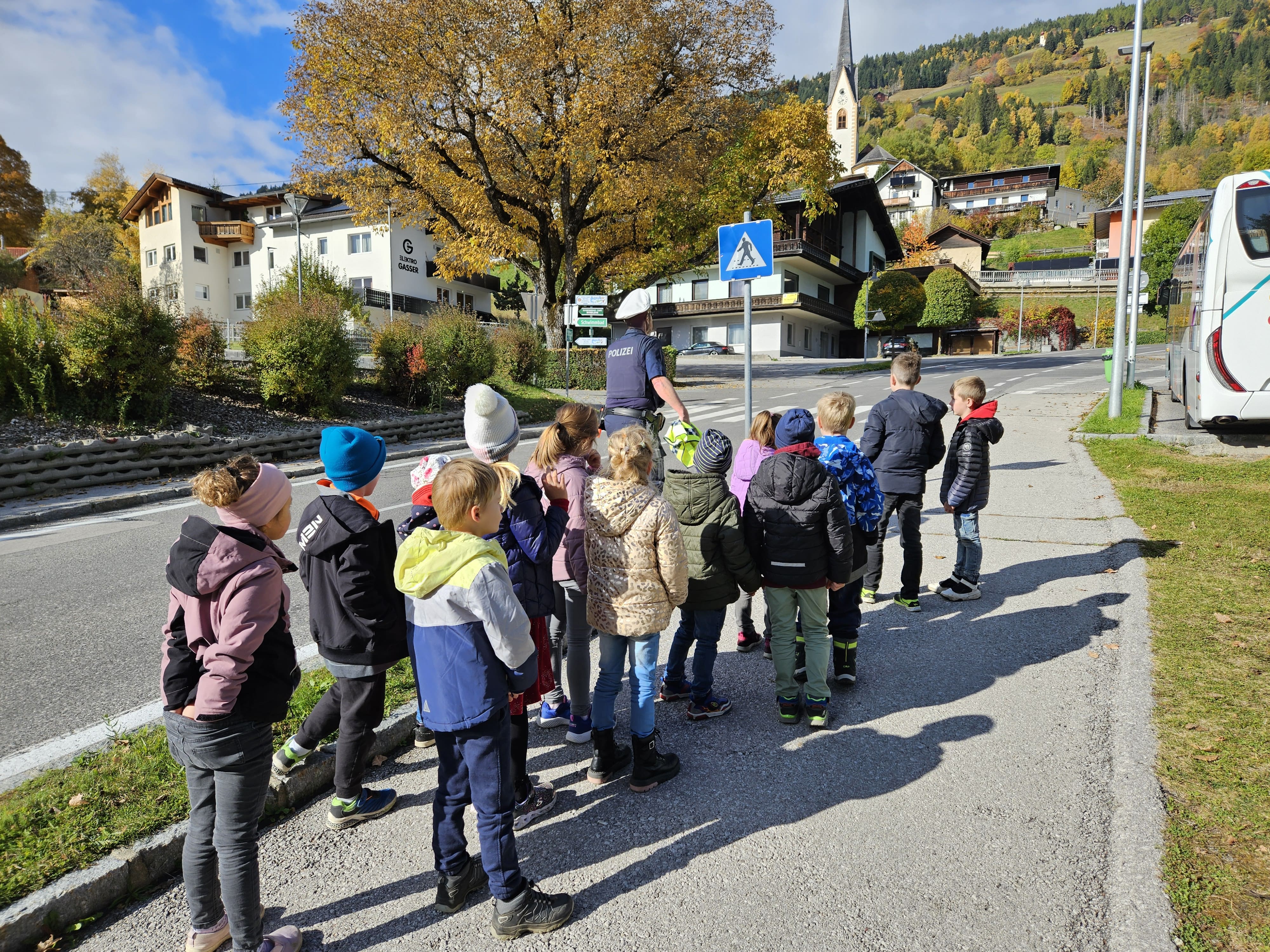 Hauptthema war sicheres Verhalten im Straßenverkehr, vor allem aber auf dem Schulweg. Dabei wurde nicht nur über die passende Bekleidung, um für andere Verkehrsteilnehmer unterwegs gut sichtbar zu sein, gesprochen, sondern auch das richtige Überqueren einer Straße geübt.