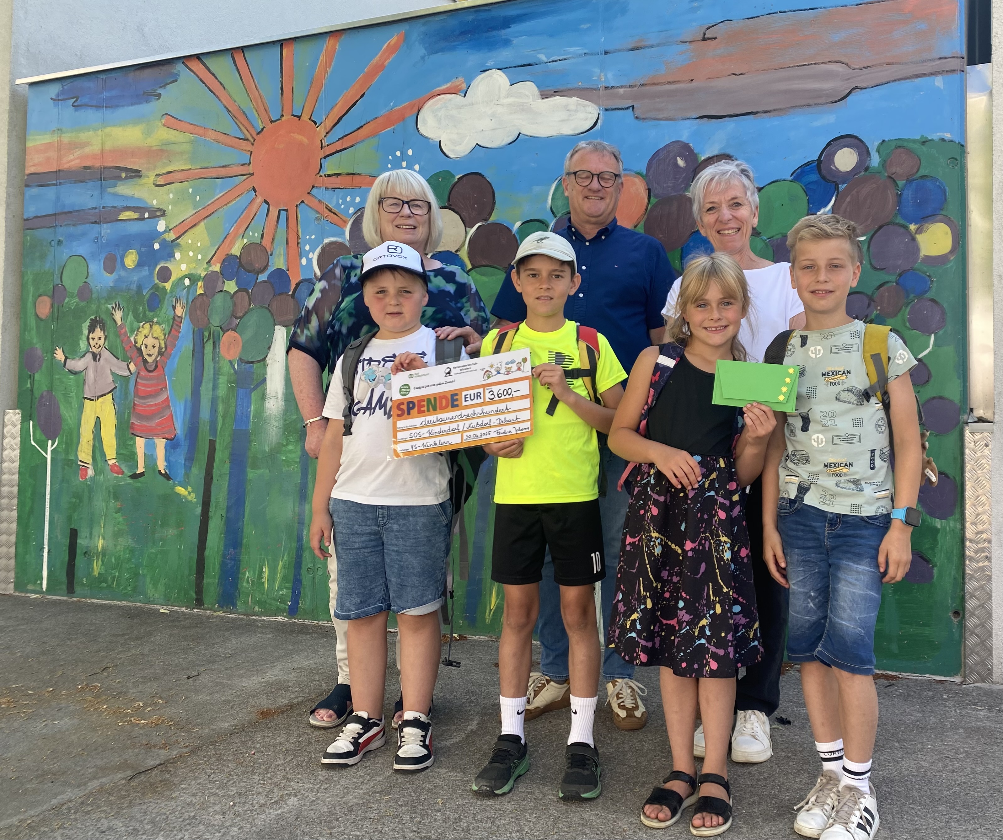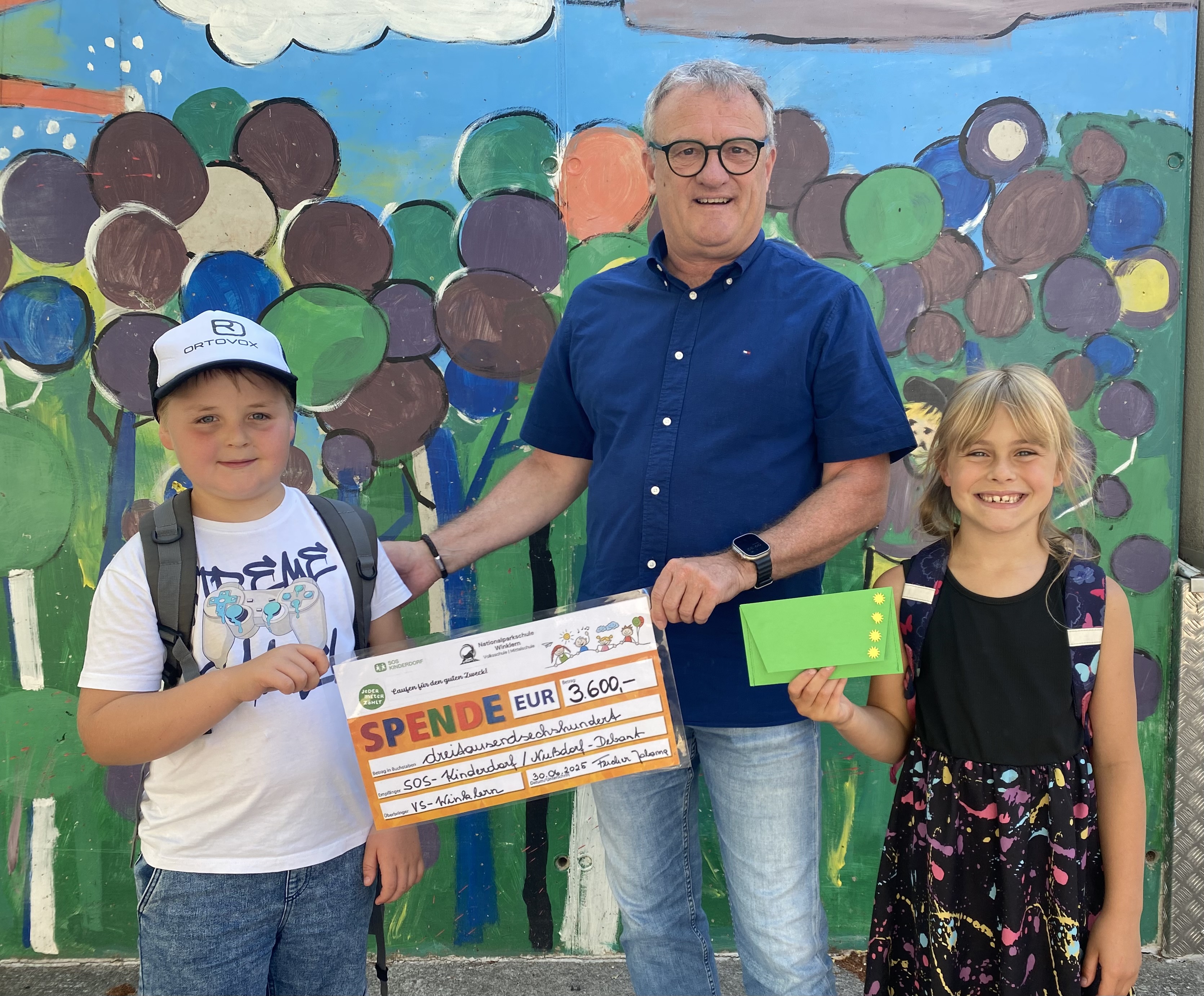 Rechtzeitig vor Schulschluss überreichten Schüler:innen der Volksschule die erlaufene Spende an das SOS-Kinderdorf in Nußdorf/Debant.