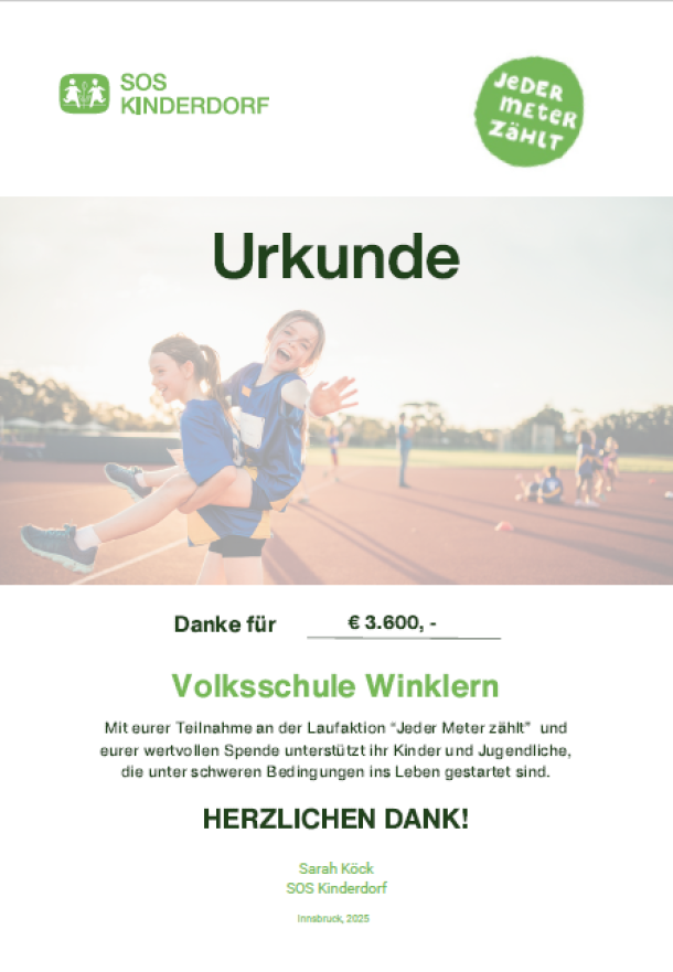Die Freude darüber war groß und der Betrag wird für besondere Ferienaktionen verwendet. Von der Zentrale „SOS-Kinderdorf“ erhielten wir ein Dankesschreiben und eine Urkunde für die großartige Leistung unserer Schüler:innen.
